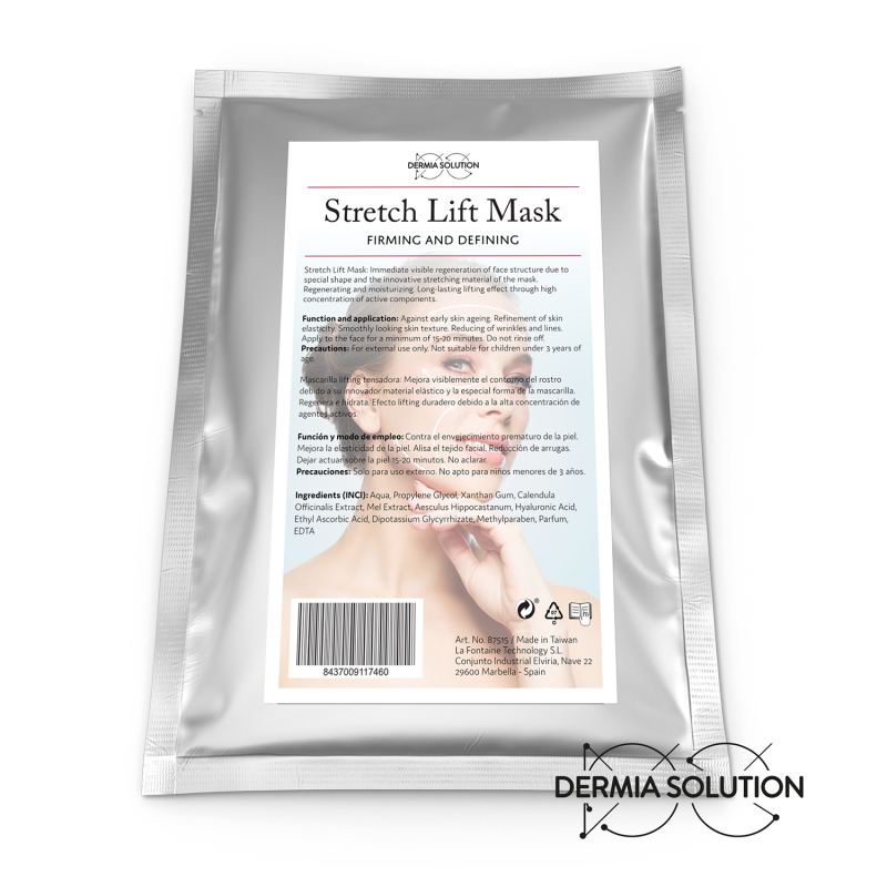 Maska na twarz przeciwzmarszczkowa. Maska ma nietypową formę, gdyż jest nie tylko na twarz, ale i na podbródek. Zakłada się ją w taki sposób, że maska ma doskonałe działanie liftingujące i napinające skórę. Maska działa silnie nawilżająco, łagodząco i regenerująco na skórę. Stretch Lift Mask jest wykonana ze specjalnej elastycznej włókniny przyjemnej dla skóry. Materiał ma bardzo wysoką chłonność, dzięki czemu liquid z substancjami aktywnymi jest w 100% nanoszony na skórę twarzy. Następuje błyskawiczne wchłanianie, co zabezpiecza przed zbyt szybkim i niepożądanym odparowaniem. Maska podczas procesu wchłaniania zmniejsza swoją objętość co dodatkowo liftuje skórę mechanicznie. Polecana do wszystkich zabiegów Dermia Solution, nawet po stosowaniu mikroigieł, bez ryzyka podrażnienia skóry. Maska ma działanie silnie łagodzące, co po intensywnych zabiegach jest wskazane. Stretch Lift Mask to również maska na twarz do domowego spa.