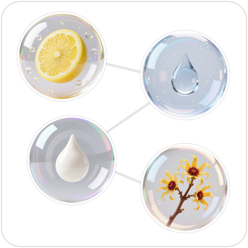 INCI AQUA, CITRIC ACID, GLYCOLIC ACID, LACTIC ACID, SODIUM HYDROXIDE, HAMAMELIS VIRGINIANA EXTRACT, PHENOXYETHANOL, CELLULOSE GUM, ETHYLHEXYLGLYCERIN